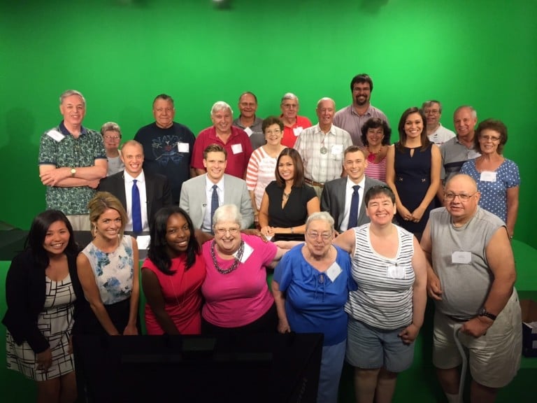 We started with a meet and greet downstairs where we all enjoyed wonderful food and drinks catered by 2J’s Barbeque. We then provided a tour of our new virtual studio where everyone had the chance to experience the 6pm news live. Afterwards, pictures were taken (image above) where the weather watchers got to meet other reporters and news anchors.